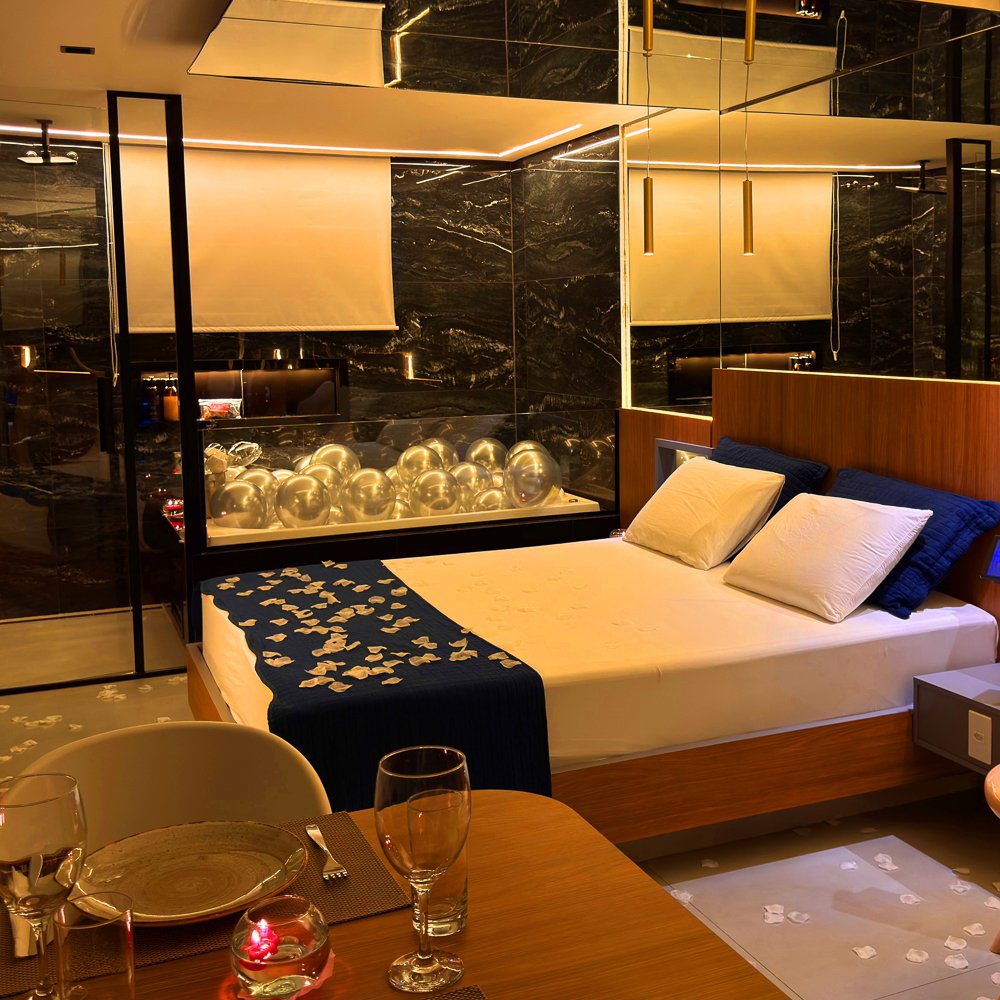 O romance encontra o brilho da virada do ano. A decoração em tons de prata e dourado cria um clima acolhedor e elegante, pensado para envolver o casal em uma atmosfera de paixão e celebração.